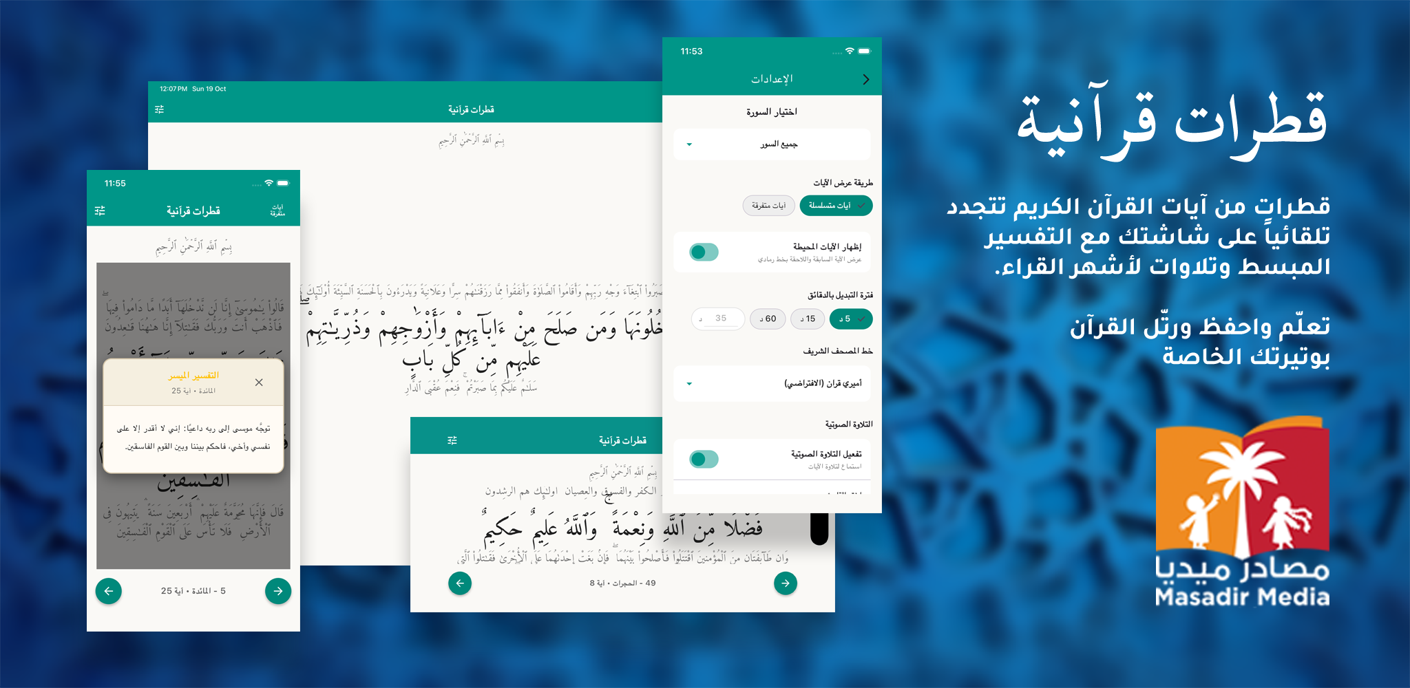يقدم تطبيق قطرات قرآنية آيات قرآنية متجددة مع تفسير مبسط وتلاوات مميزة، ليكون رفيقك في رحلة إستكشاف وحفظ وترتيل القرآن الكريم بسهولة ويسر.